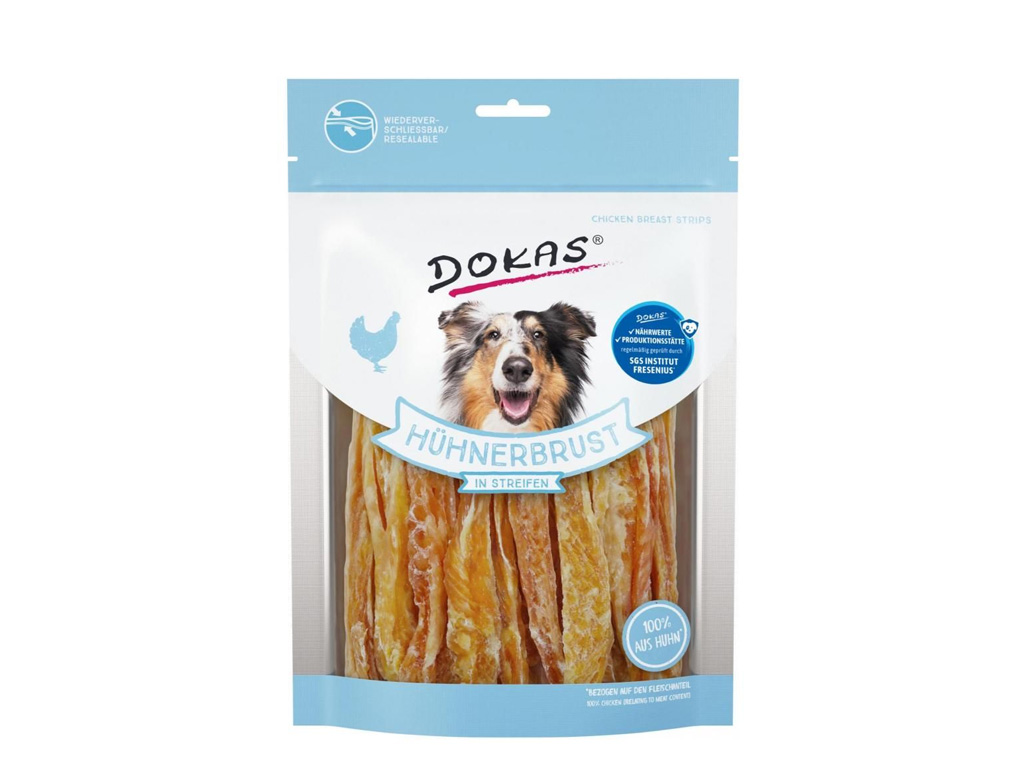 Dokas kyllingebryststrimler af skånsomt lufttørret kyllingebryst. Naturlige premium godbidder lavet af kyllingekød, der er rig på protein og indeholder vigtige næringsstoffer. Lækre strimler, som er særdeles velegnede som en smagfuld godbid mellem måltiderne.